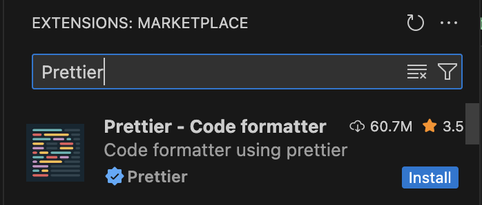 - 毎回、手動でコマンドを実行するのは面倒くさいのでファイル保存時に実行されるようにするため、VS CodeのExtentionsから、”Prettier - code formatter”をインストールする。