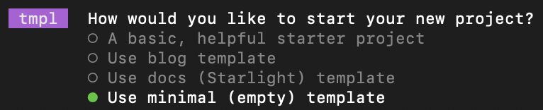npm run dev うまく立ち上がると、ターミナルにはローカルサーバのURLが表示されるので、URLをコピーしてブラウザでアクセスすると、初期状態のastroのサイトが確認できる。