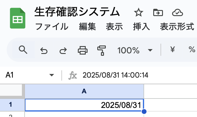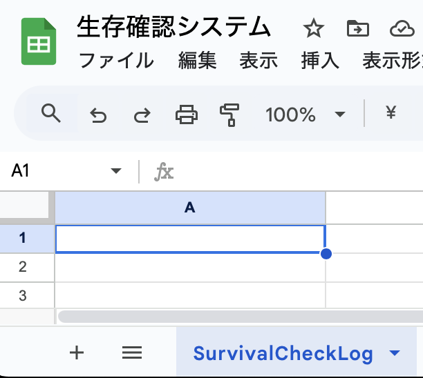 スプレッドシート[生存確認システム]を作成し、”SurvivalCheckLog”というシートを追加した。指定のURLにアクセスするとA列には最終のタイムスタンプがA1に上書き更新されていくことで、最終生存確認日が分かるような仕組みとする。