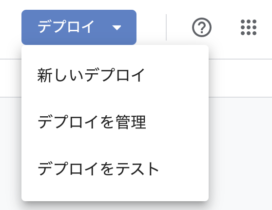 Apps Scriptの編集画面の右上にデプロイボタンがあるので、これをクリックすると、新しいデプロイ/デプロイを管理/デプロイをテストが表示される。今回は新規でデプロイすることになるので、新しいデプロイを選択する。
