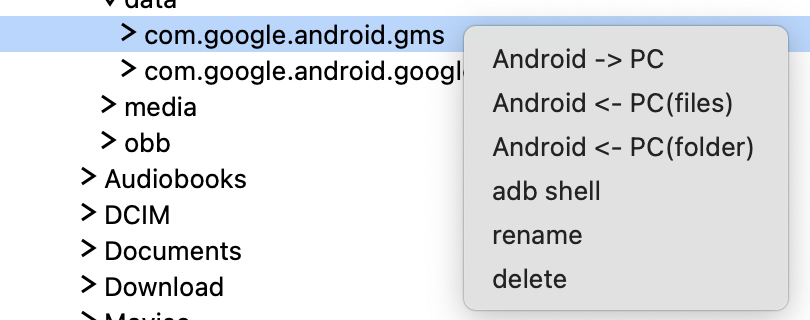 右クリックのメニューから、”Android ← PC(files)”または”Android ← PC(floder)”を選択すると、MacからAndroidへファイルを転送することができます。こちらは、ディレクトリツリーからフォルダを一つだけ選択している場合にのみ利用することができます。